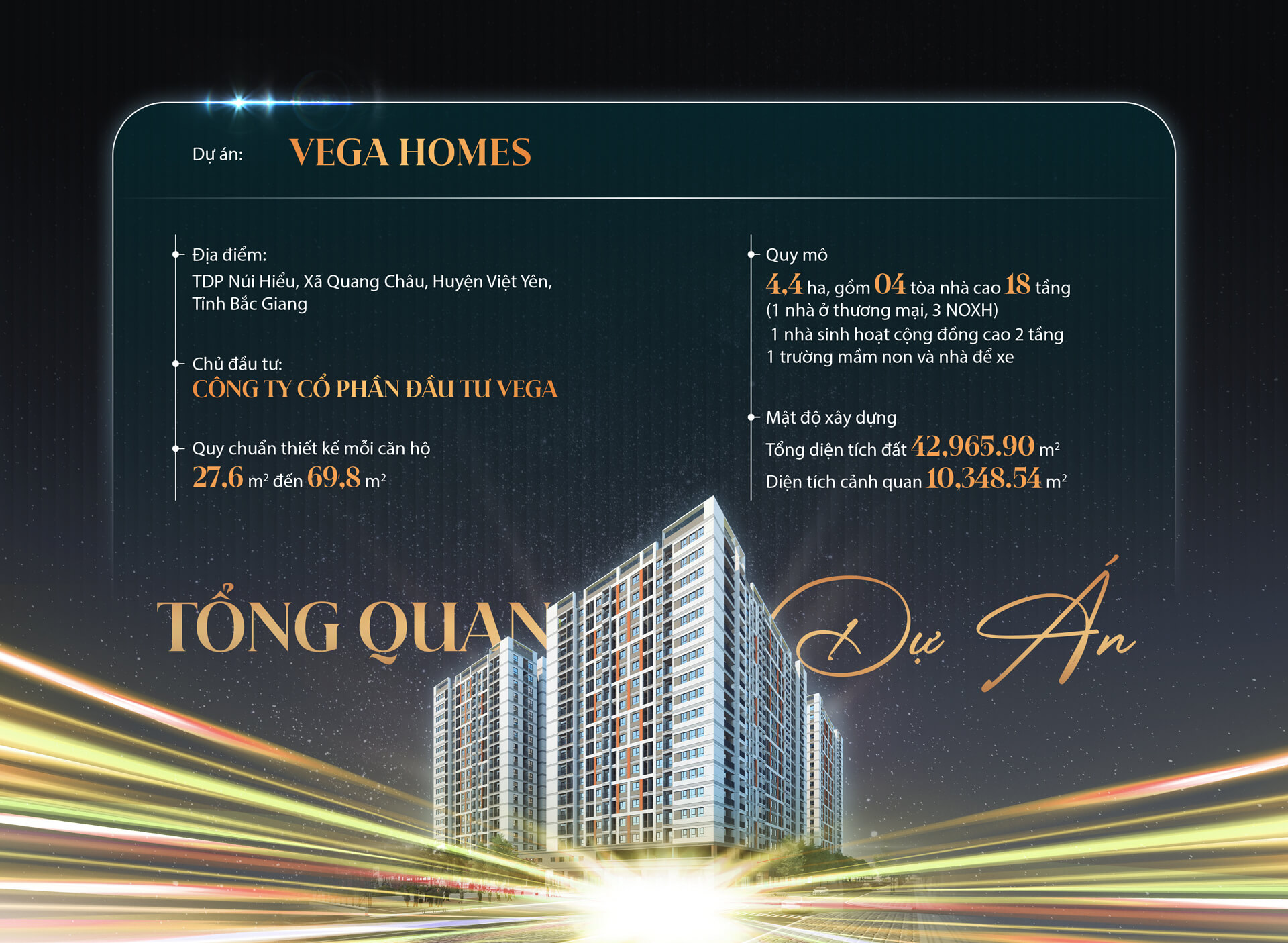Vega Homes là dự án tiên phong, mang lại không gian sống chất lượng cao cho cư dân sinh sống và làm việc tại các khu vực lân cận. Dự án là sự giao thoa hoàn hảo giữa kiến trúc hiện đại và không gian xanh, tạo nên một môi trường sống lý tưởng, thoải mái và tiện nghi. Với 4 tòa tháp cao 18 tầng, mỗi căn hộ trong dự án đều được thiết kế tinh tế nhằm tối ưu hóa không gian sử dụng, mang lại sự tiện lợi và thoải mái tối đa cho cư dân. Điểm đặc biệt là diện tích căn hộ đa dạng từ 27,6m² đến 69,8m², phù hợp với nhu cầu của nhiều đối tượng. Dự án còn tích hợp nhiều tiện ích vượt trội như nhà sinh hoạt cộng đồng 2 tầng, nơi cư dân có thể giao lưu và tổ chức các sự kiện, cùng với trường học ngay trong khuôn viên, mang lại sự an tâm tuyệt đối về môi trường giáo dục cho con em.