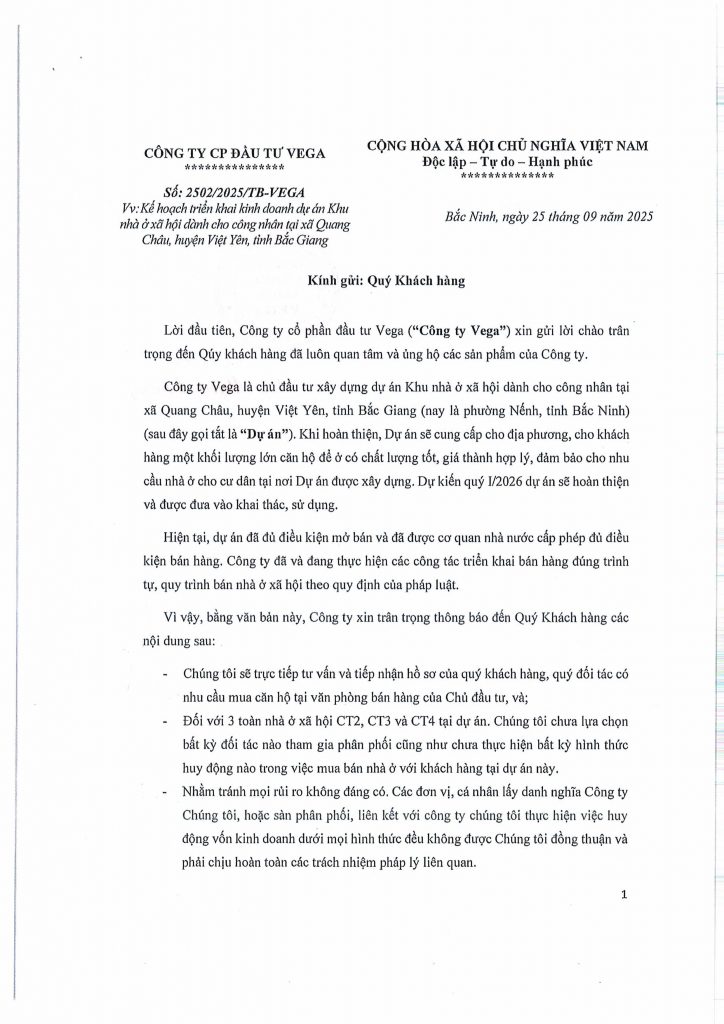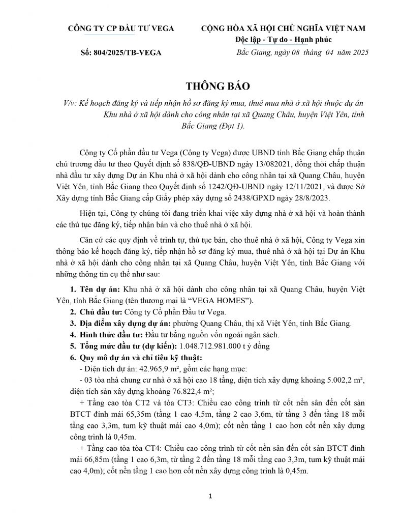 Dự án Vega Homes, quy mô 4,4ha, tọa lạc tại tổ dân phố Núi Hiểu, phường Quang Châu, thị xã Việt Yên, tỉnh Bắc Giang, được đầu tư bởi Công ty CP Đầu tư Vega.