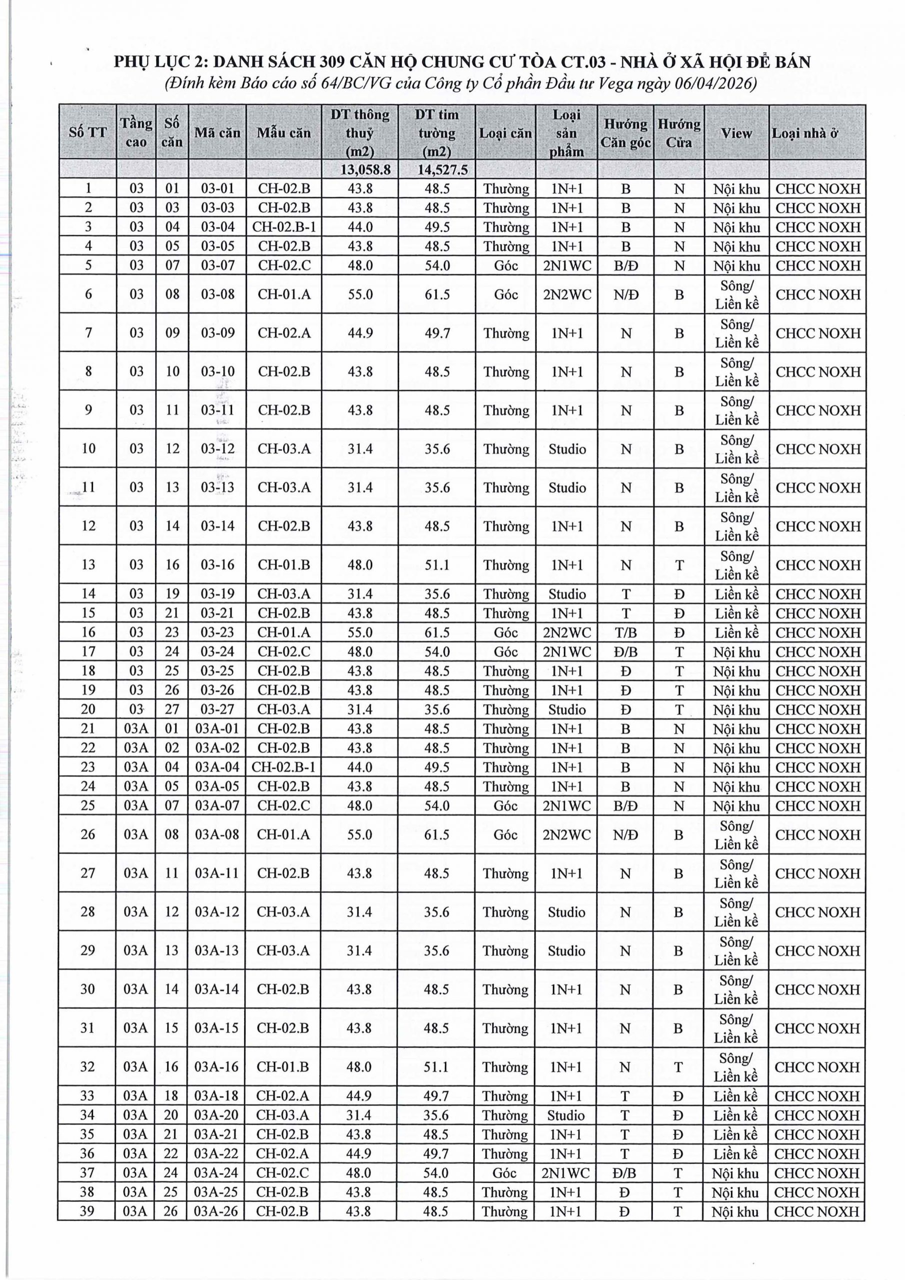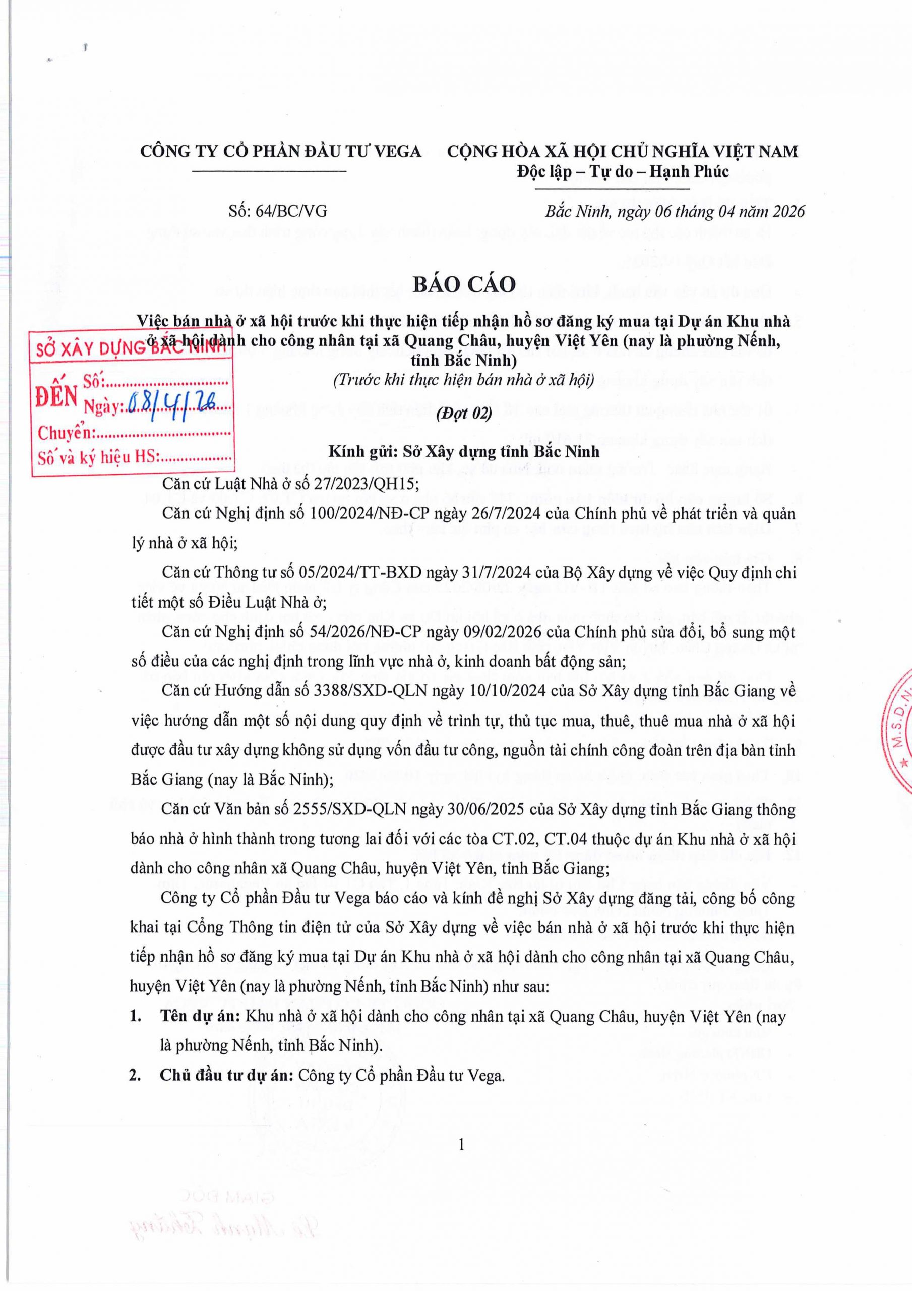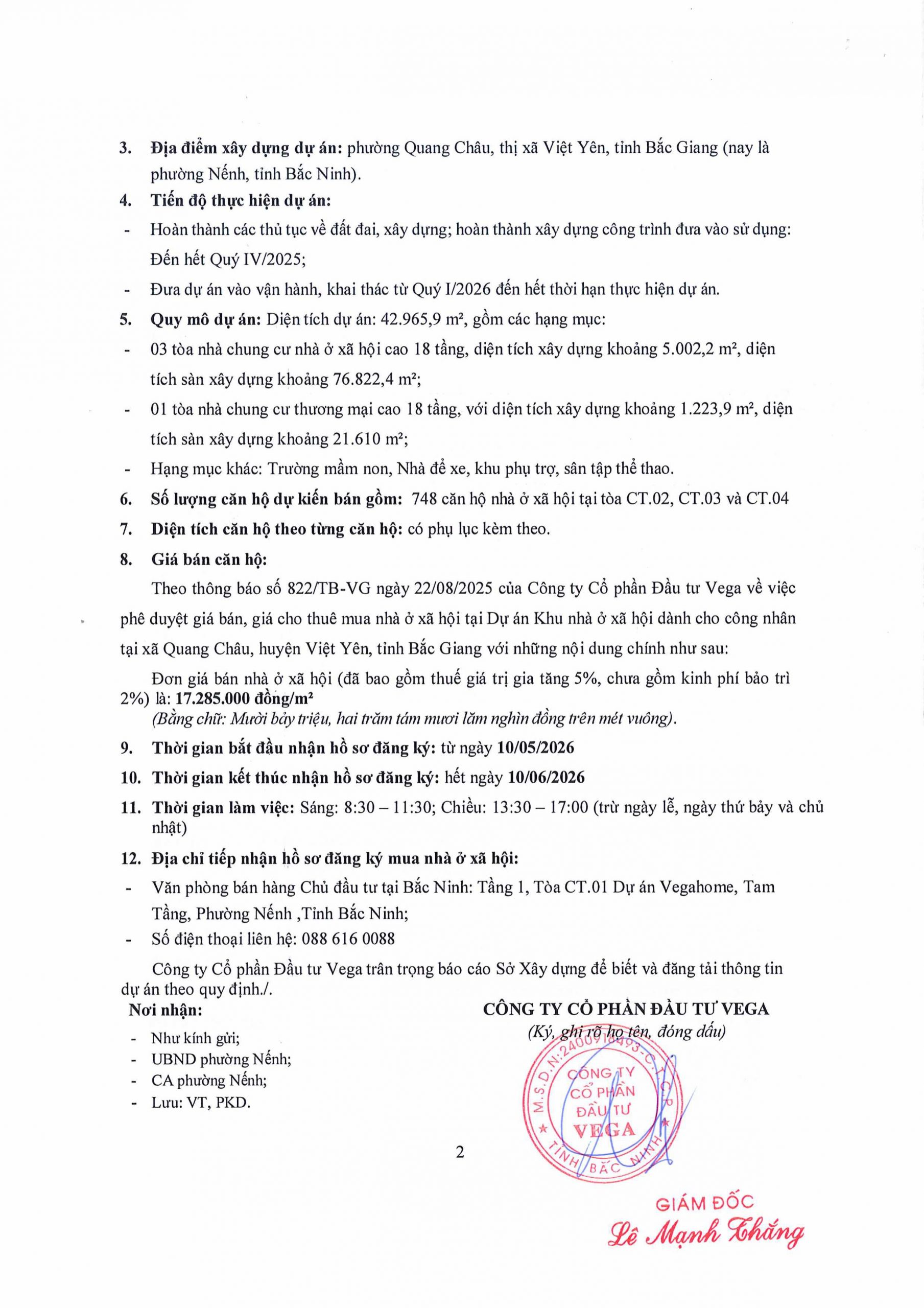 THÔNG BÁO: Điều chỉnh thời điểm dự kiến bàn giao căn hộ thuộc Tòa nhà CT.01 Dự án Khu nhà ở xã hội dành cho công nhân xã Quang Châu, huyện Việt Yên, tỉnh Bắc Giang (nay là phường Nếnh, tỉnh Bắc Ninh) (“Dự án Vega Homes”)
