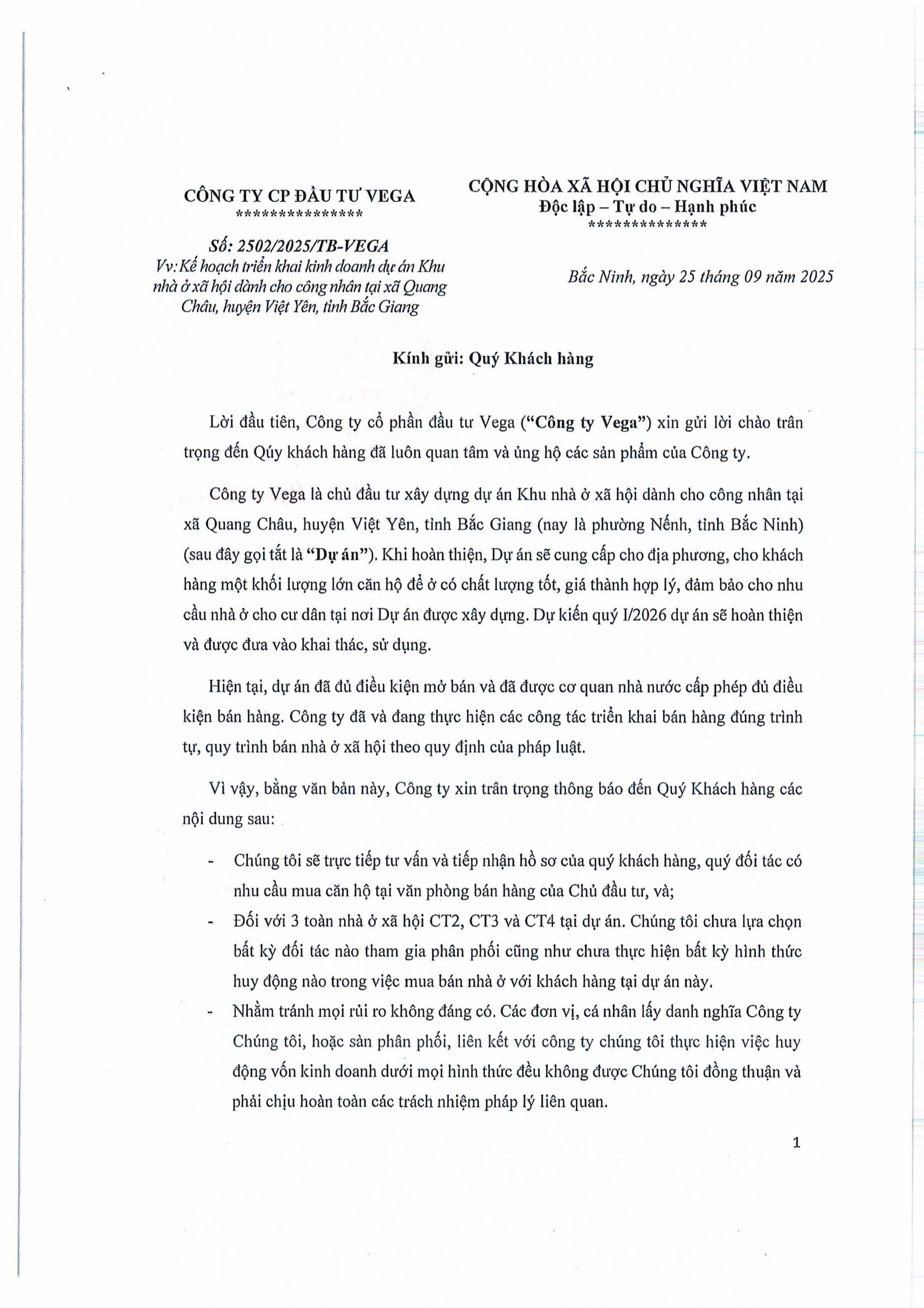 Sở Xây dựng: Thông báo việc bán, cho thuê, cho thuê mua nhà ở xã hội trước khi thực hiện tiếp nhận hồ sơ đăng ký mua, thuê, thuê mua tại Dự án Khu nhà ở xã hội dành cho công nhân tại xã Quang Châu, huyện Việt Yên, tỉnh Bắc Giang (nay là phường Nếnh, tỉnh Bắc Ninh)