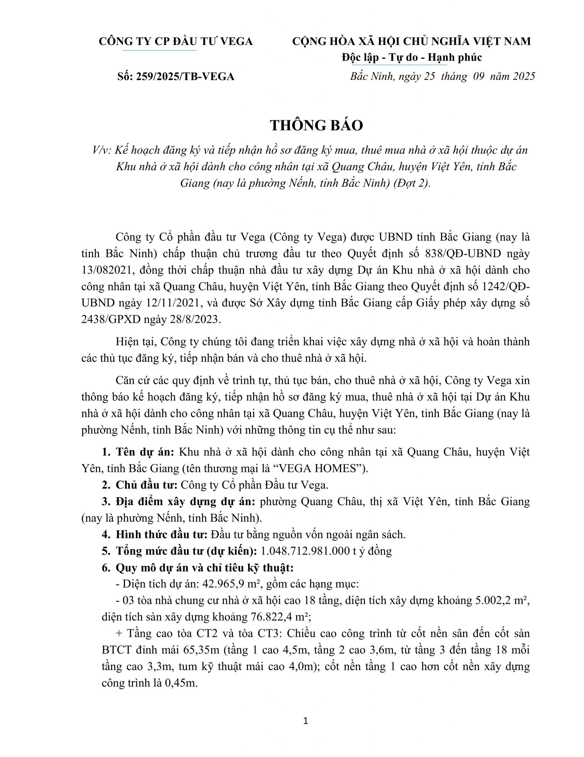 THÔNG BÁO LẦN 2: Kế hoạch đăng ký và tiếp nhận hồ sơ đăng ký mua, thuê mua nhà ở xã hội thuộc dự án Khu nhà ở xã hội dành cho công nhân tại xã Quang Châu, huyện Việt Yên, tỉnh Bắc Giang ( nay là phường Nếnh, tỉnh Bắc Ninh )